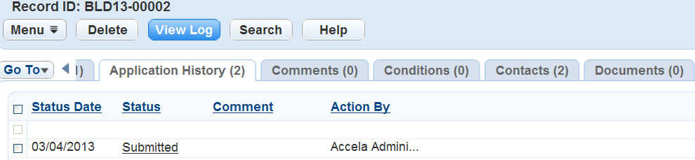 When a user clicks the View Log button in the Application History tab of a record, the Record Status History displays, and details all changes to an application’s status.