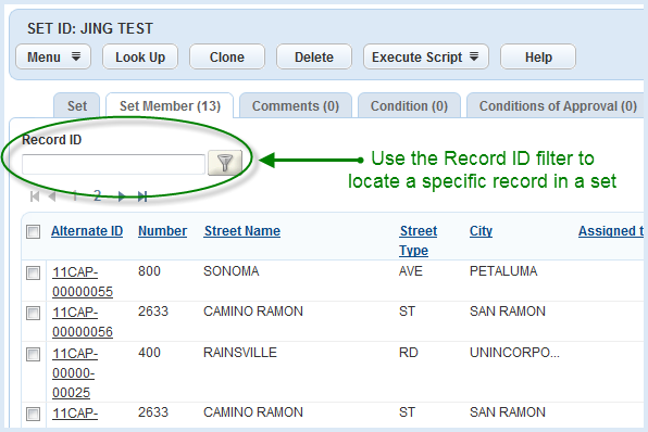 The Sets portlet has a Record ID filter, enabling you to query a set member list to locate a record in the set, then modify the record or delete it from the set. This filter enables you to query the set member list using both Record ID and Alt-ID.