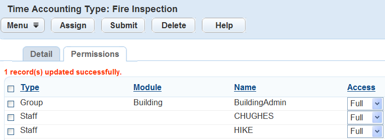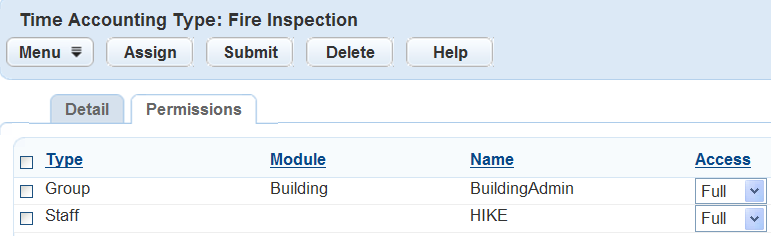 If you associate the Time Accounting type with a Time Accounting group, the assignments and access level might already exist. You can update or assign additional user groups or individual users, as appropriate. For example, a group of home inspectors assigned to the Electrical Inspection type can have full permission to view and edit Time Accounting information for that type.