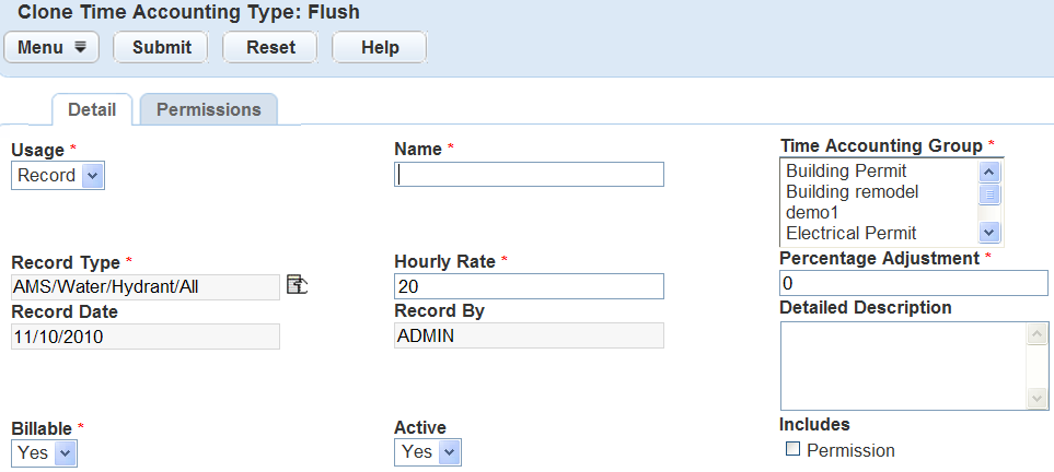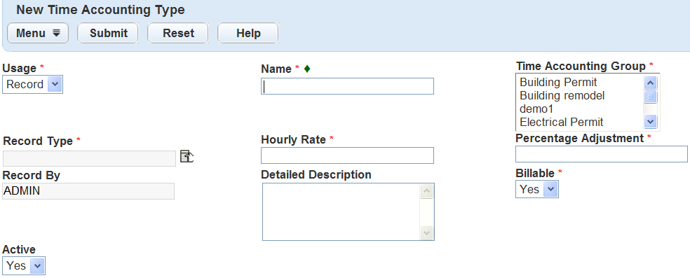Table 1. Time Accounting Type Detail Fields Active Select whether this type is Active or Inactive. Billable Select whether the agency can bill for this type. The default status is “Yes.” Record Type Use the picker to select the Record Type, Sub Type, and Category. Users can select any level of the navigation tree. For example, if you select the Building group, the type displays as Building\ALL\ALL\ALL. If you select N/A in the Usage field, this field automatically locks at “ALL” and you cannot make any other selections. Detailed Description Enter a description for this type. Hourly Rate Enter the rate per hour for this type. The Hour Rate can be zero, or any positive or negative value. This field must remain at zero if the user enters a value in the Percentage Adjustment field. Name Enter a name for this Time Accounting type. Name is a required field. Percentage Adjustment Enter the percentage adjustment for this type. For example, 1.25 equals 125%. The Percentage rate can be zero or any negative or positive value. This field must remain at zero if the user enters a value in the Hourly Rate field. Record By This field displays the user who last updated the record. This field auto-populates. Record Date This field displays last record update date. This field auto-populates. Time Accounting Group This field displays all active Time Accounting groups. Usage Select either Record or N/A record type in the drop-down list. The default is Record, and indicates the Time Accounting type is mandatory to process the application. N/A indicates that the type has no relationship to a specific application. If you select N/A, the Record Type fields Group, Type, Sub Type, and Category locks at “ALL,” and you cannot make any other selections.