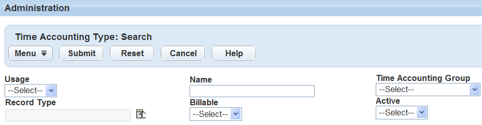 For instructions on how to search for an existing Time Accounting type, see Searching for a Time Accounting Type.