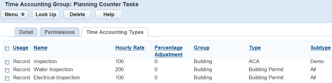 A Time Accounting type is the application that the user is recording time for, such as an electrical inspection. When users enter time, the options available depend on group permissions, profile settings, and the record type or application type for which the user is entering time. You can define Time Accounting types for use in any application type. Agency users can associate one Time Accounting type with multiple groups.