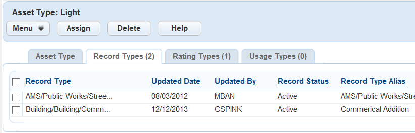 When you associate asset types with record types, you consolidate and filter the data that displays for users to view during daily processing. As a result, the user only sees applicable record types for that particular asset type, which eliminates the possibility of accidentally choosing an invalid option from a large list of choices.