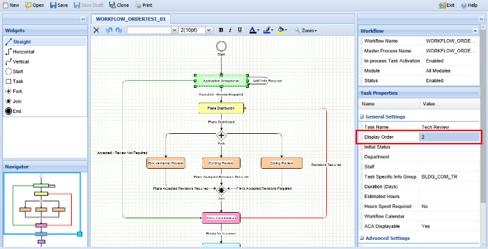 By selecting a workflow task and specifying a display order between 1 and 999, users can control how the task is displayed in the new Workflow Designer window. This will not affect the order in which the tasks must be completed, but only the order in which they are displayed. Users will find this useful when designing a workflow that includes multiple parallel tasks that can be processed concurrently, but when a specific display order makes sense.