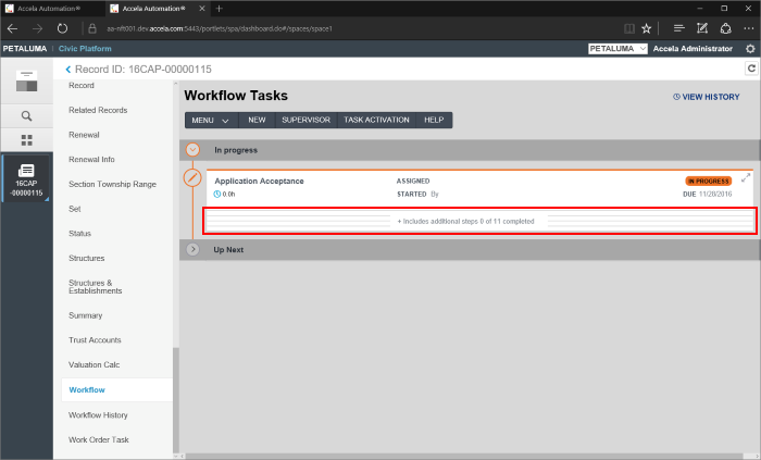 Each set of workflow tasks, Completed, In Progress and Up Next, can be collapsed in order to help the user focus on a specific task or set of tasks. The Completed and Up Next tasks will be collapsed by default. Users can quickly expand collapsed task sets and then expand the individual tasks that are most pertinent to their jobs. This puts important information, such as Task-specific information (TSI) or ad hoc processes, at the user's fingertips without presenting an overly detailed and distracting view of the entire workflow process.