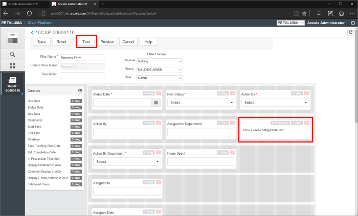 Users can also use the Text button on the task menu to create a static text field in the grid. This text field can be placed anywhere on the grid and edited to display user instructions, hyperlinks or other custom content.