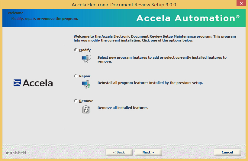 If you have already installed the current version of Accela Electronic Document Review client and/or Acrobat configuration files, and you need to add additional Acrobat configuration files, for example, you can run a modified installation. If you installed an older version, you must remove the existing Accela Electronic Document Review client, and then perform an initial installation using the current version.