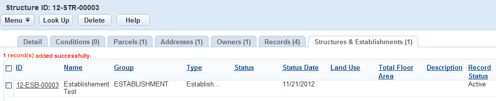 You can also associate structure and establishment records to one another. If your agency is managing a mall structure, for example, you can associate all the establishment records for the stores contained in the mall to the mall structure record. You can perform this association task in either the structure or the establishment record.