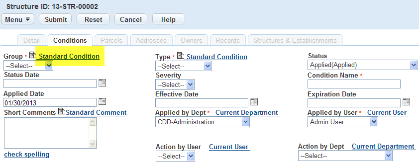 A condition is a requirement surrounding a structure or establishment. It displays in the record to show that some requirement has not been met. You can configure a condition to lock or hold a record or to provide a notice. For example, you may want to notify users when a scheduled inspection has not been completed. For detailed information on conditions, see Conditions.