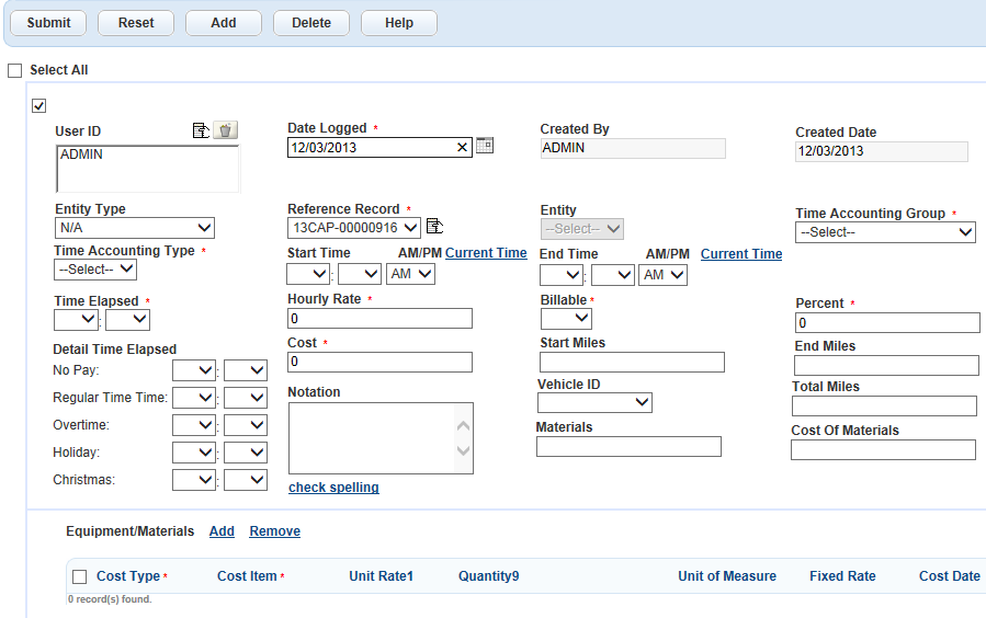Complete the fields with available data. See Equipment and Material Cost Fields for a list of fields and definitions.